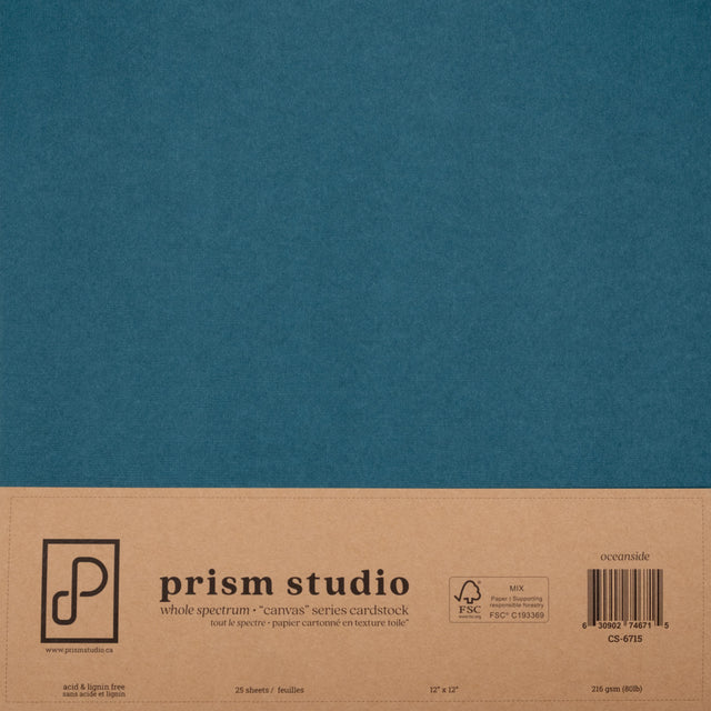 Prism Studio Whole Spectrum "Canvas" Series is a premium collection of textured 12" x 12" cardstock available in 25 vibrant hues, featuring a surface texture inspired by the rich depth of traditional canvas. The colour-core means no white edges, and solid colour throughout. 80 lb, (215 gsm), acid & lignin free, and sold in packages of 25.