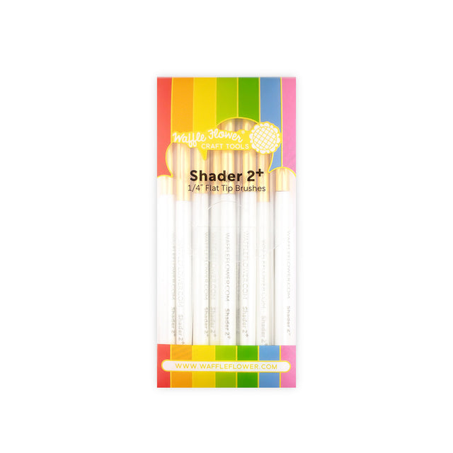 Made from high-quality, ultra-soft bristles, the Waffle Flower Shader 2+ brushes are flat-tip brushes with bristles arranged at an angle for comfort and precision. For best results, apply in a "drag-n-lift" or "flicking" motion. As the name suggests, the plus versions allow you to apply a dense layer of ink, very quickly. We designed the original shader brushes for adding colors gradually, you can build up the density by applying multiple layers of ink. As for the new plus versions, they can help you color in really quickly, especially when using stencils.