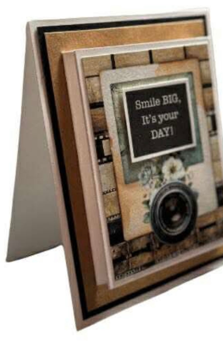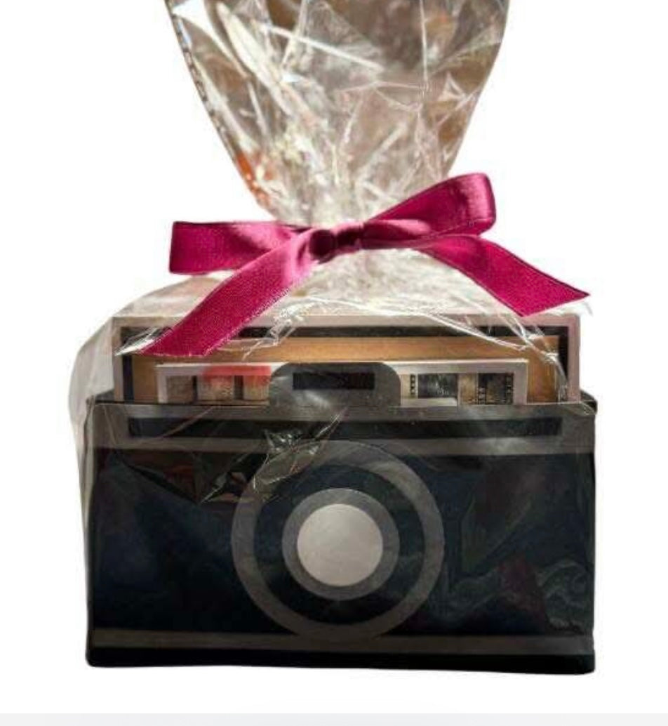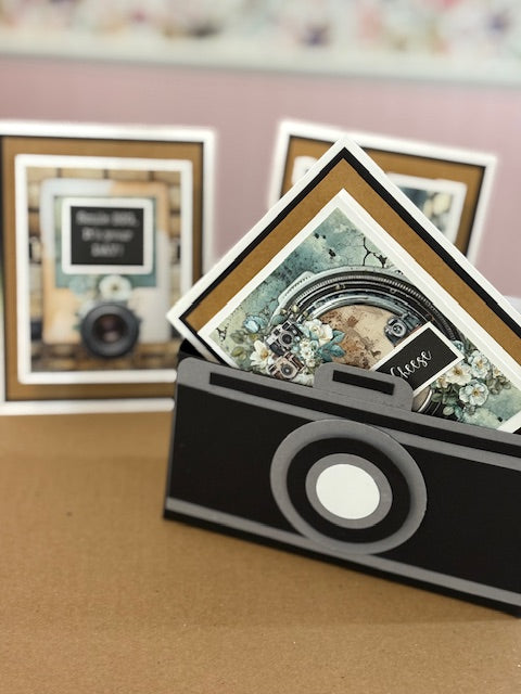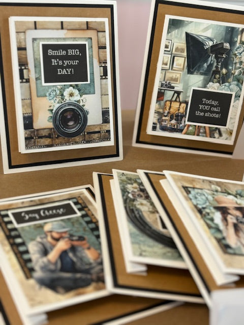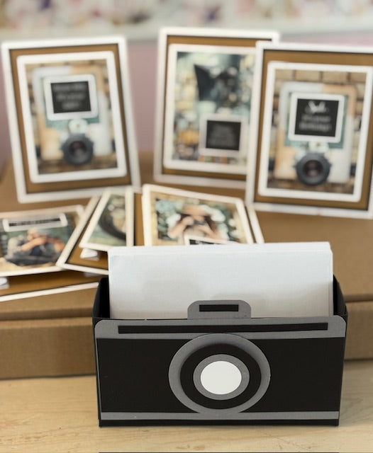 This card kit is the perfect handmade gift for a friend, hostess, teacher, client, or even yourself! it comes complete with the adorable camera packaging. this kit contains pre-cut paper to make 6 A2 cards, 6 different paper card elements, cards printed with an inside message ( Have a picture perfect day!) sentiments sheet, 6 envelopes and the ribbon needed to tie the package shut.