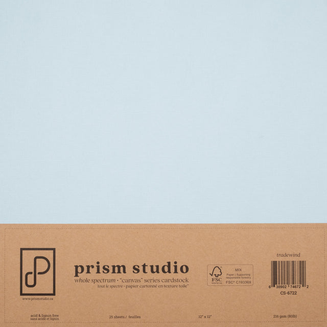 Prism Studio Whole Spectrum "Canvas" Series is a premium collection of textured 12" x 12" cardstock available in 25 vibrant hues, featuring a surface texture inspired by the rich depth of traditional canvas. The colour-core means no white edges, and solid colour throughout. 80 lb, (215 gsm), acid & lignin free, and sold in packages of 25.