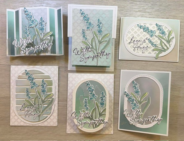 Join Marilyn and Cindy for this stunning sympathy card set. This virtual event is a bit different in that each kit comes with the stamp set, the die cut and the stencil. the good news is that you have these 3 items to use and create more beautiful cards after class is done. The class will be set a bit different in that in the morning all the stenciling will be done, then a hour lunch break will take place giving everyone a chance to get their die cutting all done and then after lunch, assembling the cards. There will be some homework also, this is a very detailed die cutting card class. WE are using only 2 inks colors, Bundled Sage and... Marilyn will get me the name...