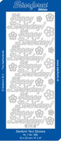 sticker sheet of happy birthday words, Black! not white but this font and with flowers.